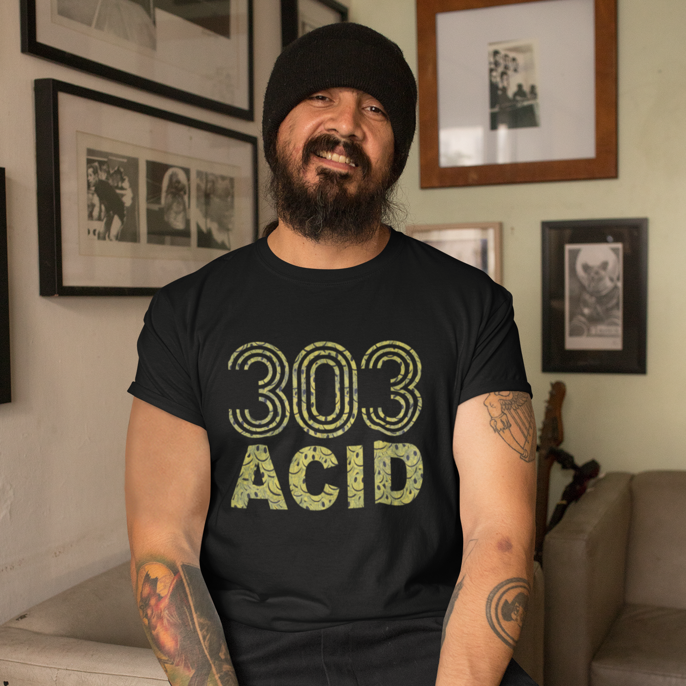 Inspired by the 808 logo, turned into 303 with acid smileys in the letters.