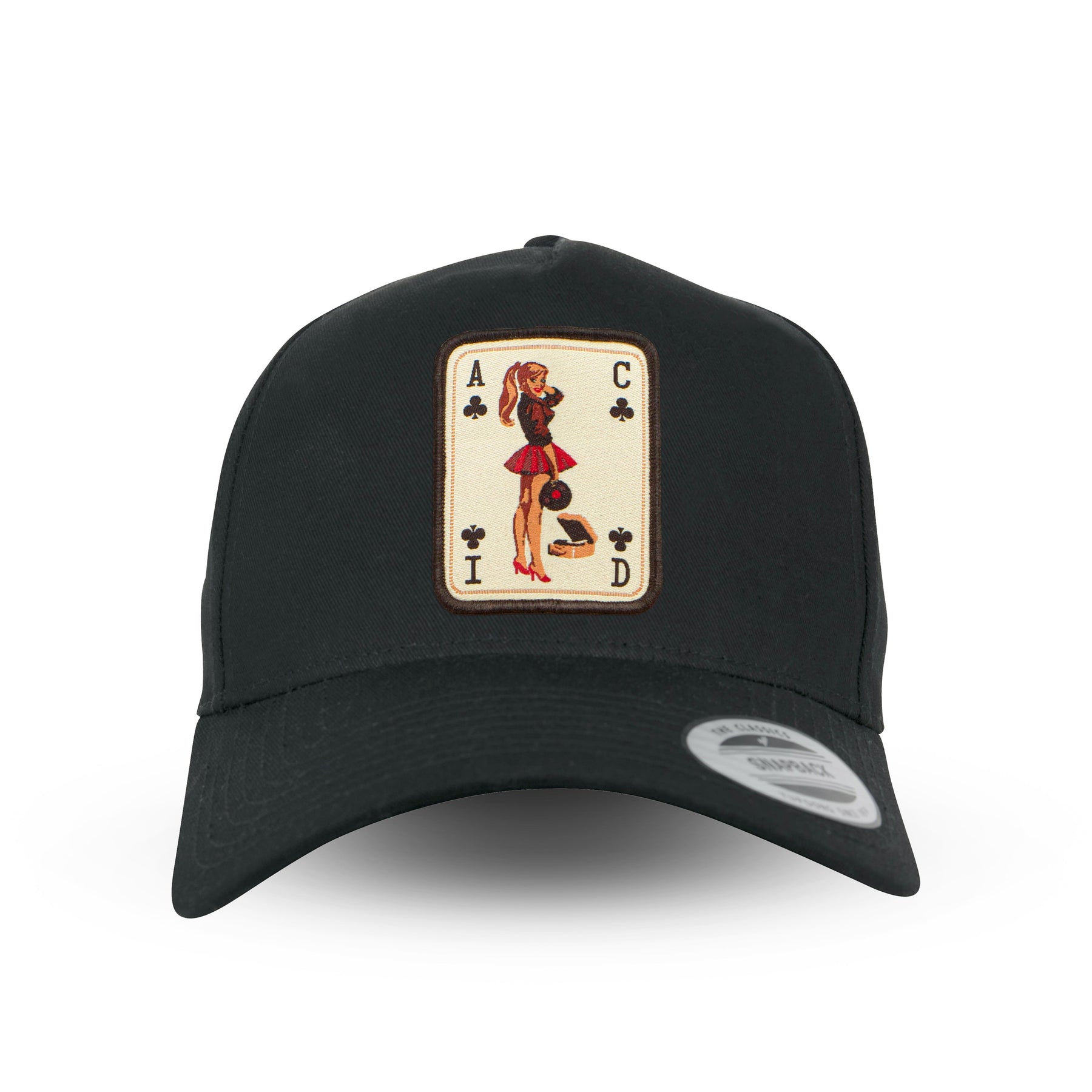 Our Acid Pinup makes her debut on a premium baseball cap just in time for summer! We've redrawn the iconic character for a 5-colour woven graphic and we're delighted with the result. Keeps you cool in the sun, and dry in the rain...never settle for boring headwear again...
