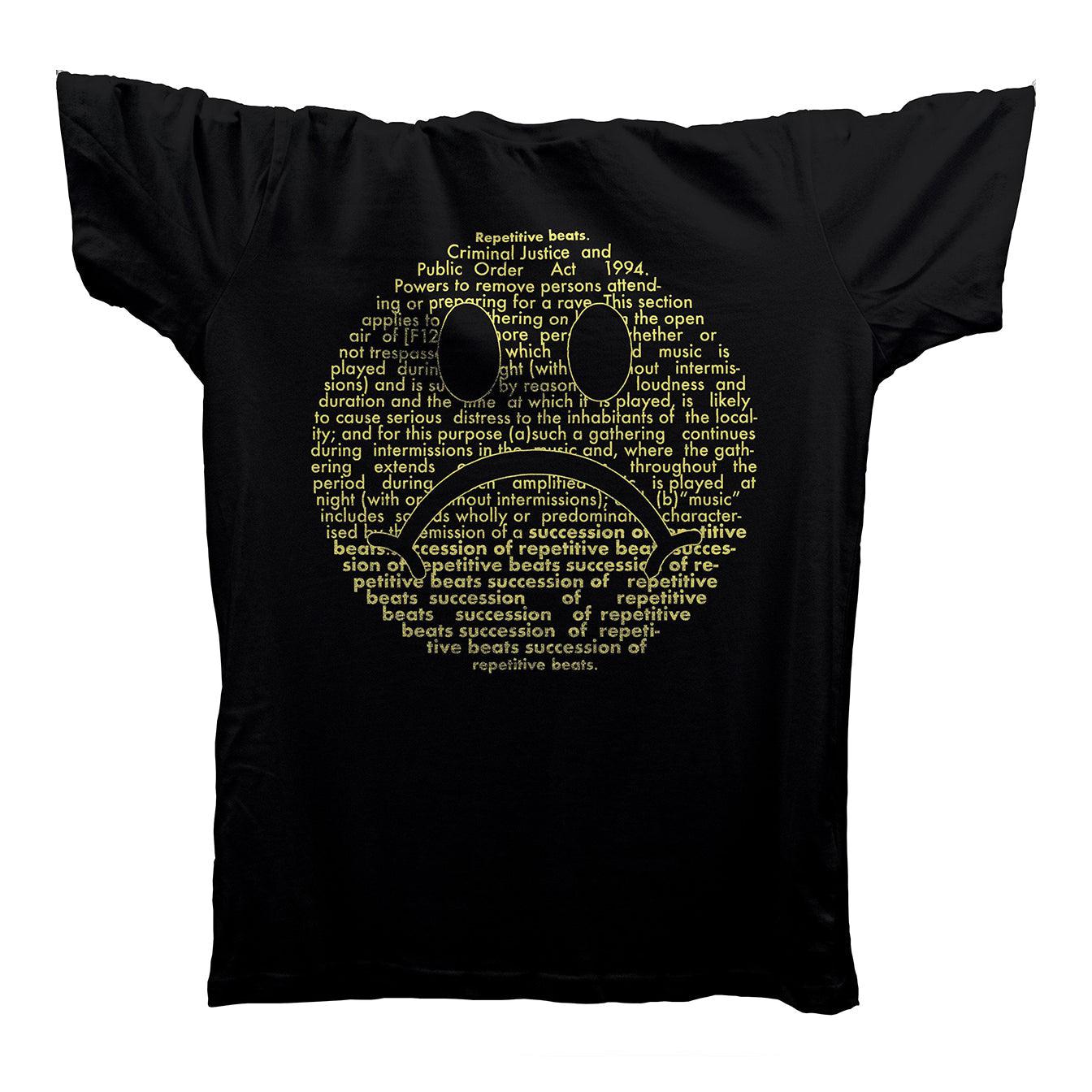 Truly original design using the infamous tory policy that was designed to stop raves that were being held in warehouses and fields. The Criminal Justice And Public Order Act 1994, designed to kill a scene of dance music that only continues to prosper. You'll never stop our repetitive beats!